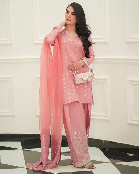 This elegant 3-piece stitched outfit features a Viscose shirt beautifully embellished with Tilla and Sequin embroidery, paired with embroidered Viscose trousers for a refined look. A Pure Organza dupatta adds a soft, graceful finish.