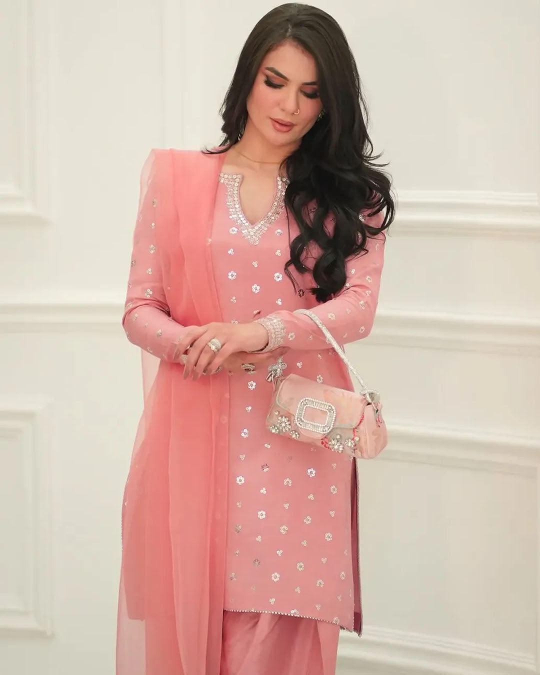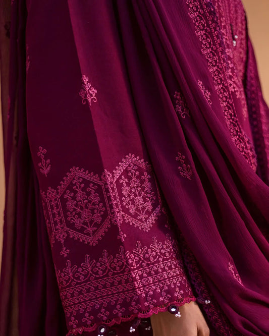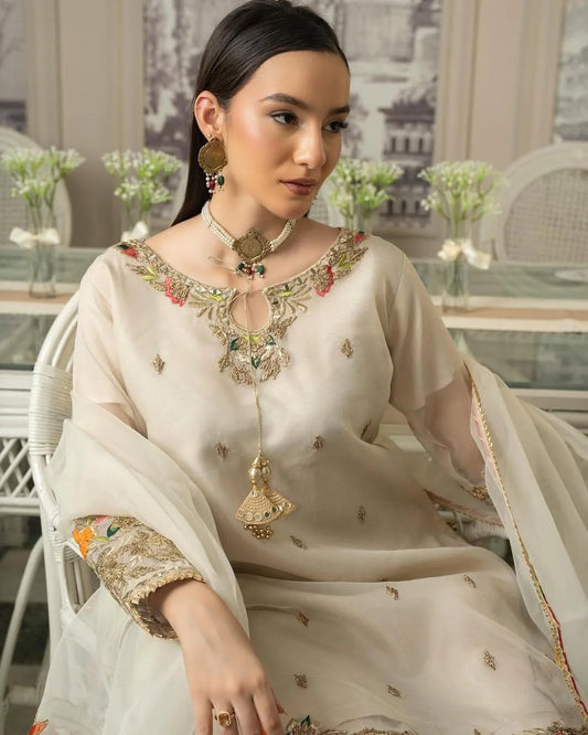 This elegant 3-piece stitched outfit features a Viscose shirt beautifully embellished with Tilla and Sequin embroidery, paired with embroidered Viscose trousers for a refined look. A Pure Organza dupatta adds a soft, graceful finish.