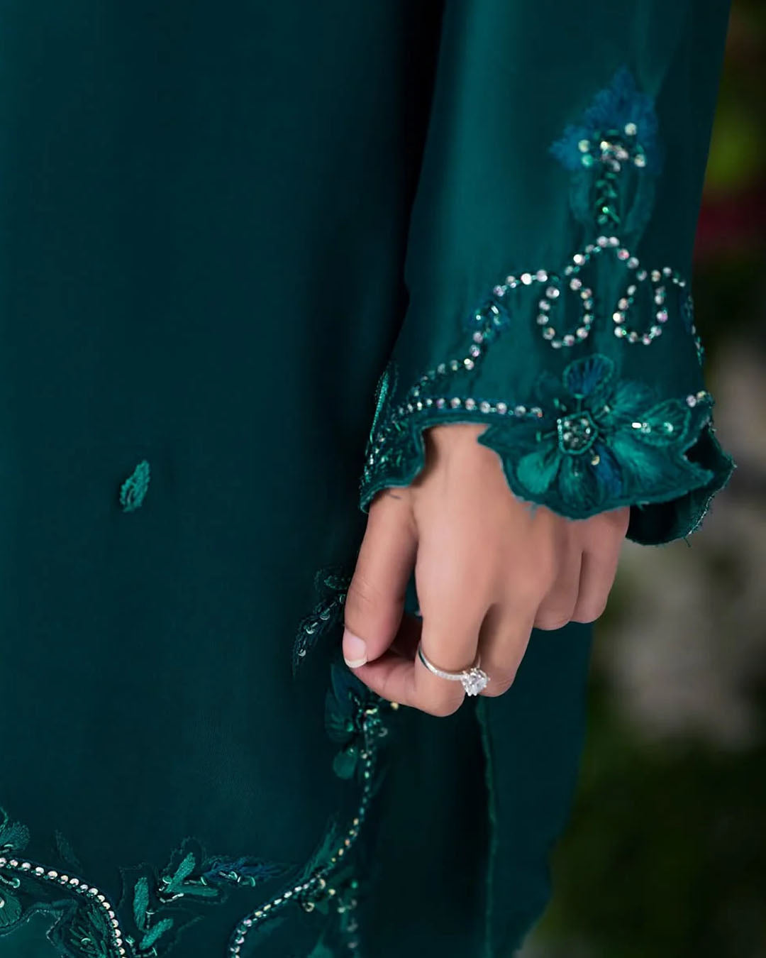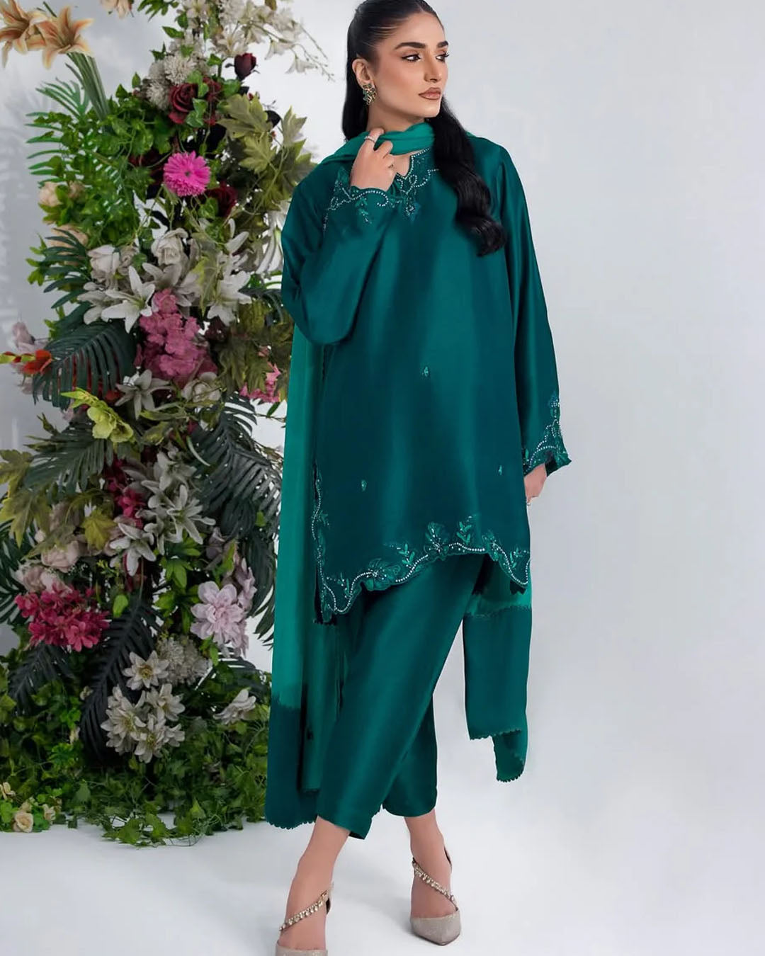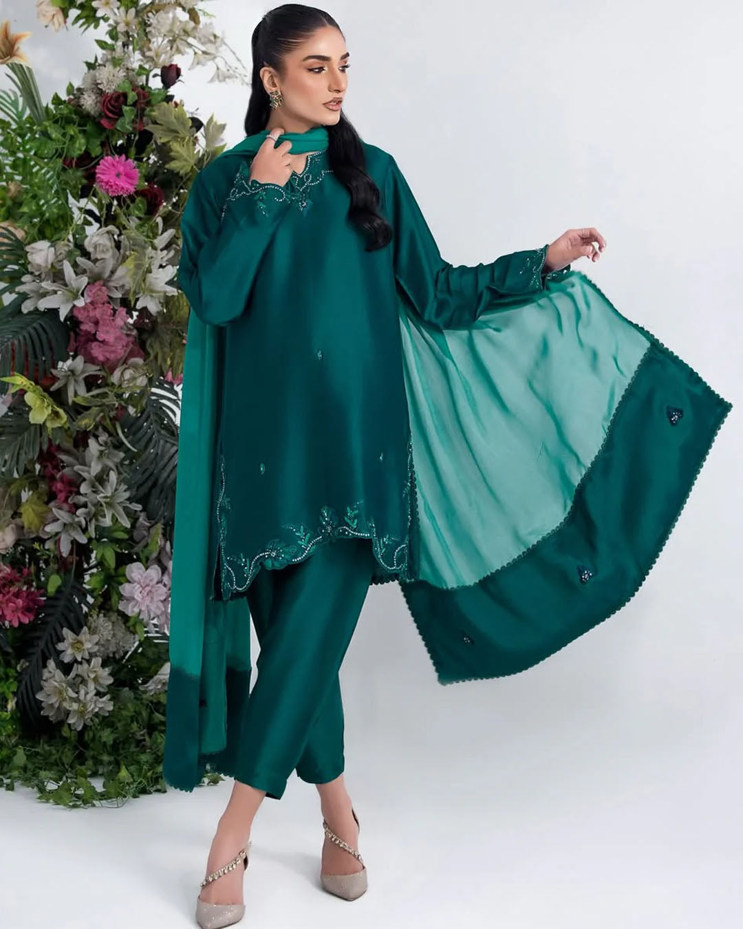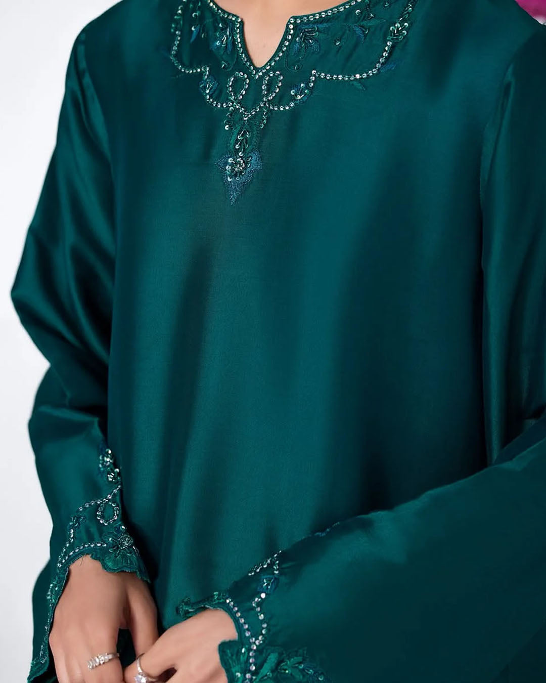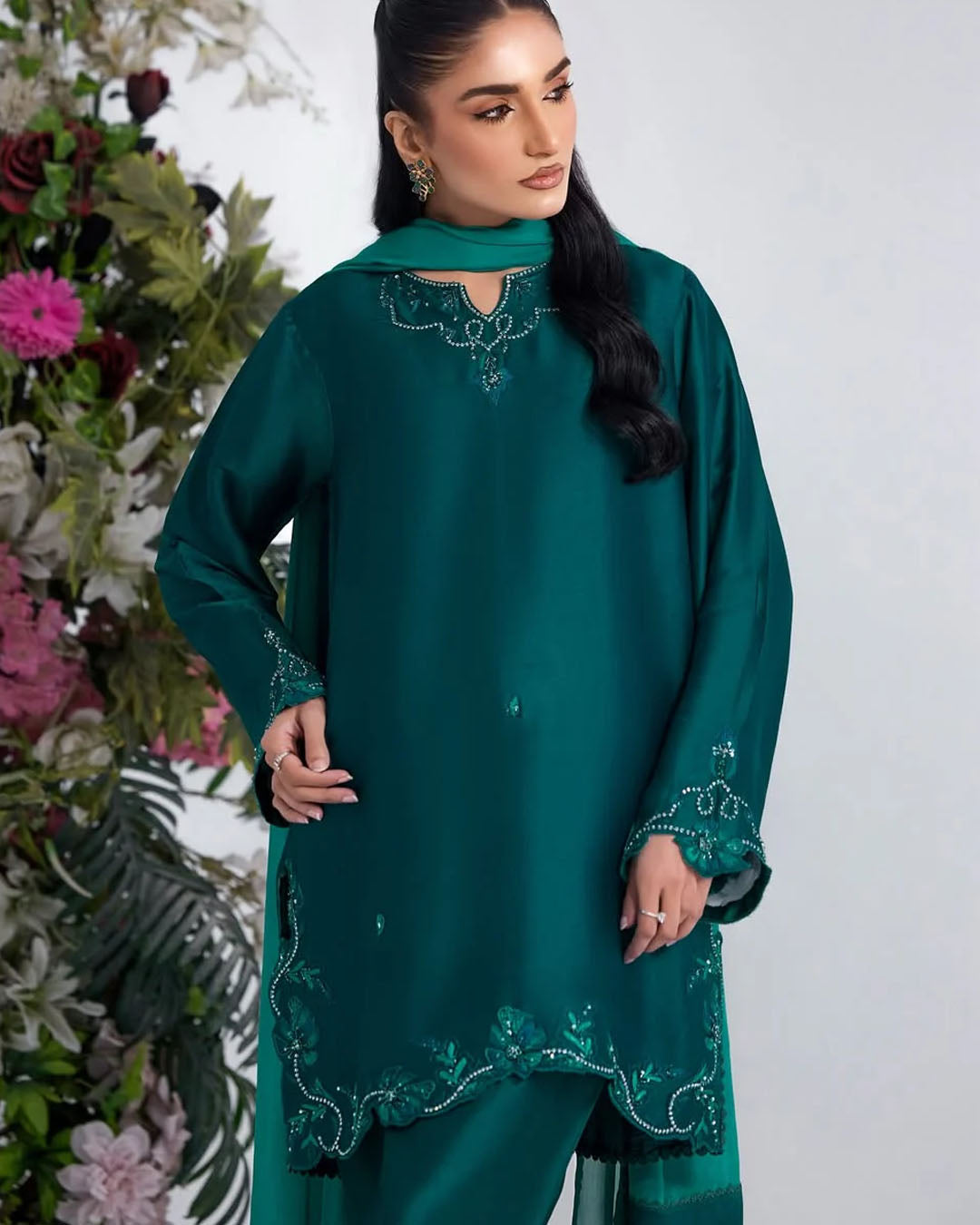 This graceful 3-piece stitched ensemble is a perfect blend of luxury and sophistication. The Pure Sheesh Silk shirt features a hand-embellished neckline, adding a touch of refined elegance. Paired with matching Sheesh Silk trousers for a sleek silhouette and a Silk-Organza bordered dupatta for a delicate, polished finish. Ideal for festive and formal occasions, this outfit embodies timeless charm and premium craftsmanship.