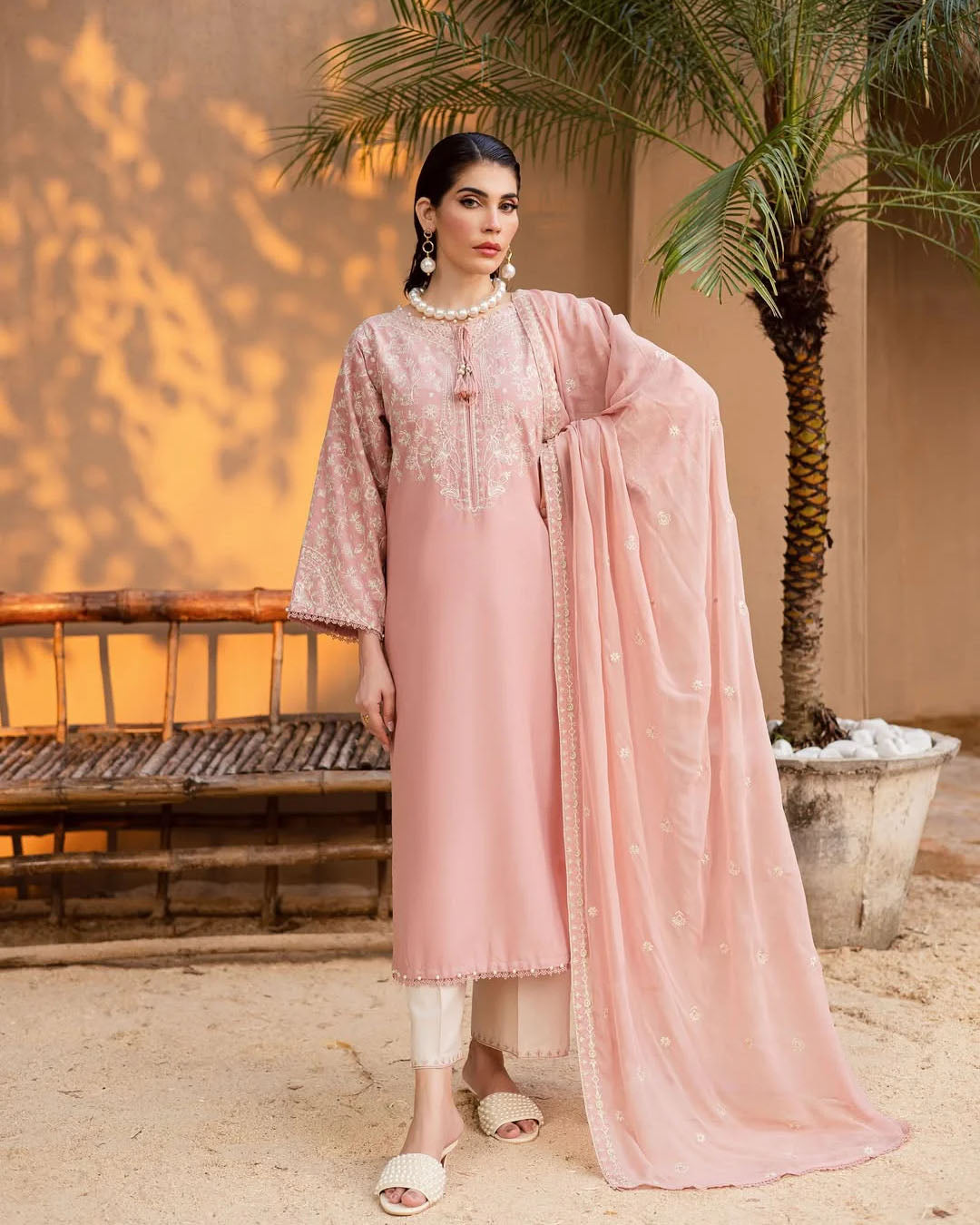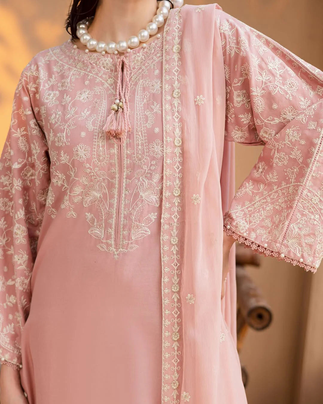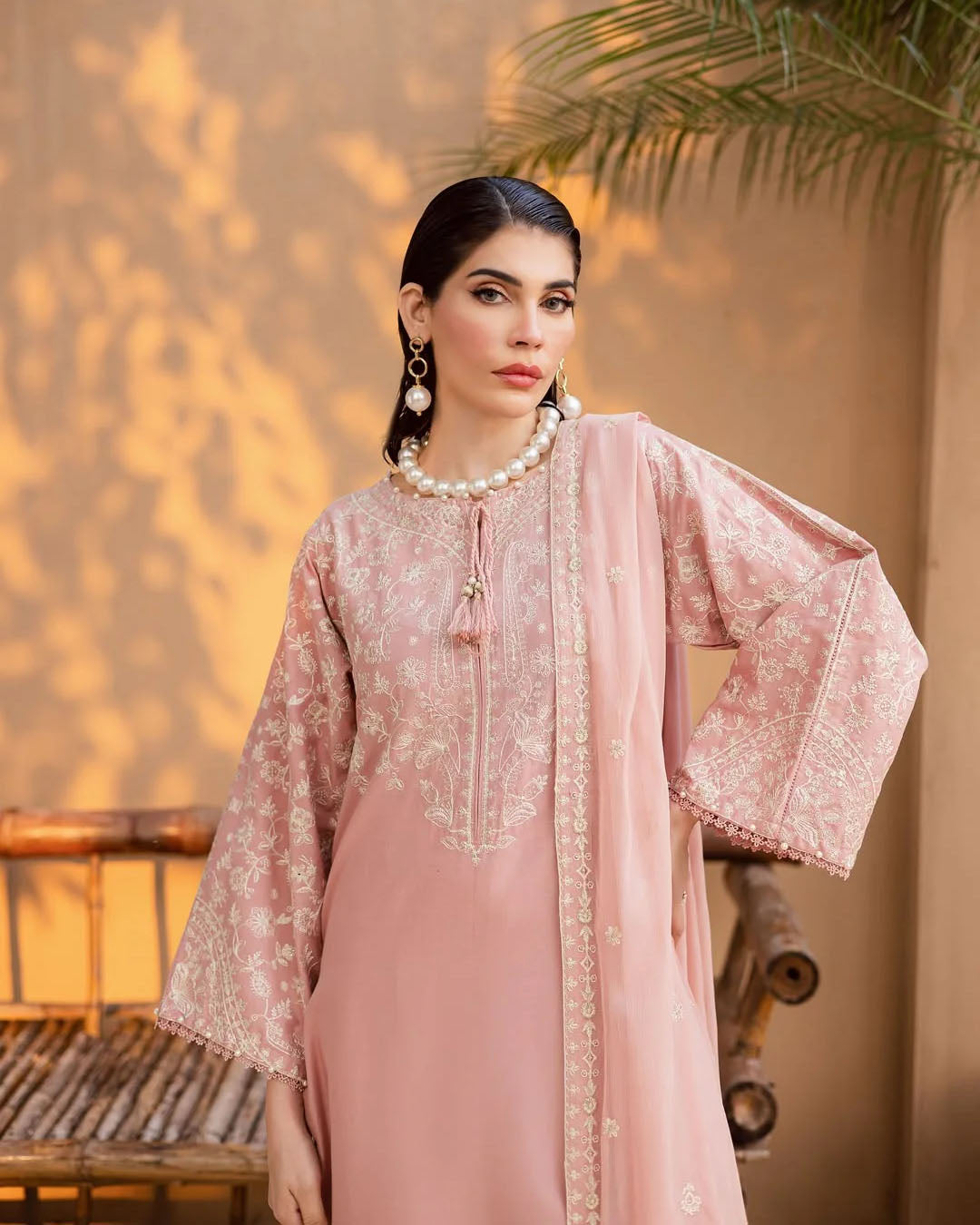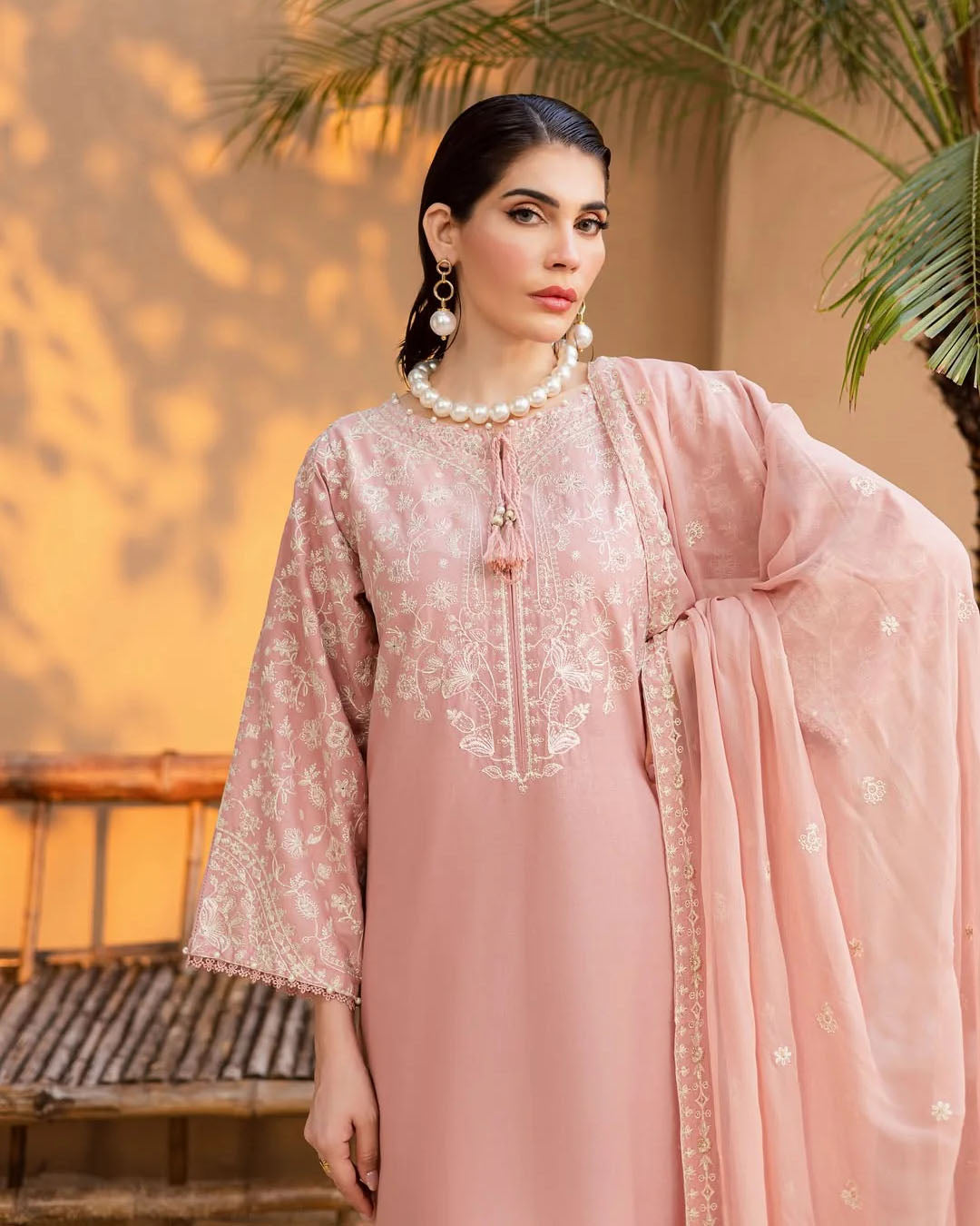 This elegant 3-piece stitched outfit features heavy embroidery on premium Khaddar, combining warmth with timeless style. The embroidered shirt, trouser, and Chiffon dupatta create a coordinated, graceful look—perfect for winter gatherings and festive occasions.