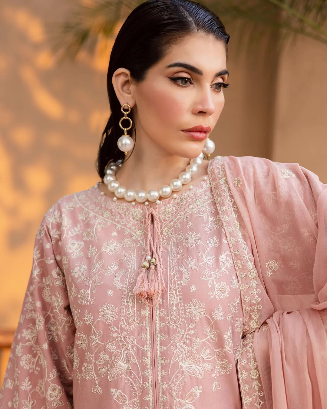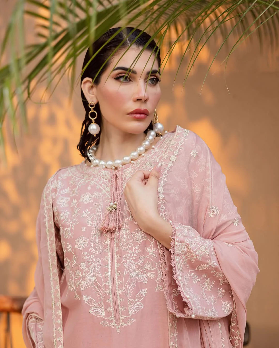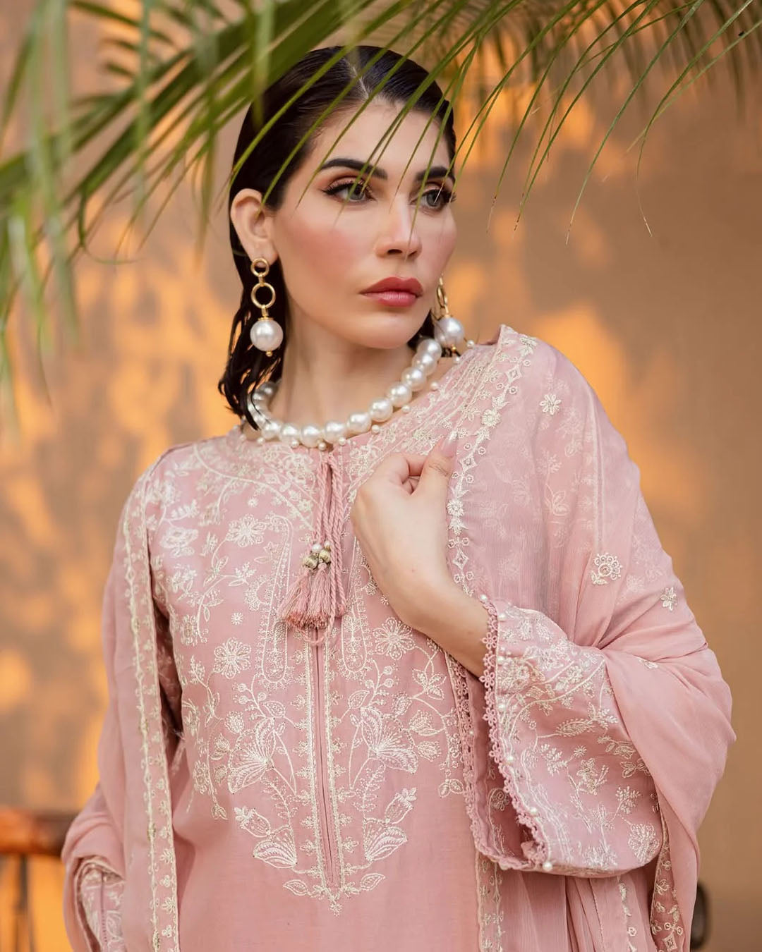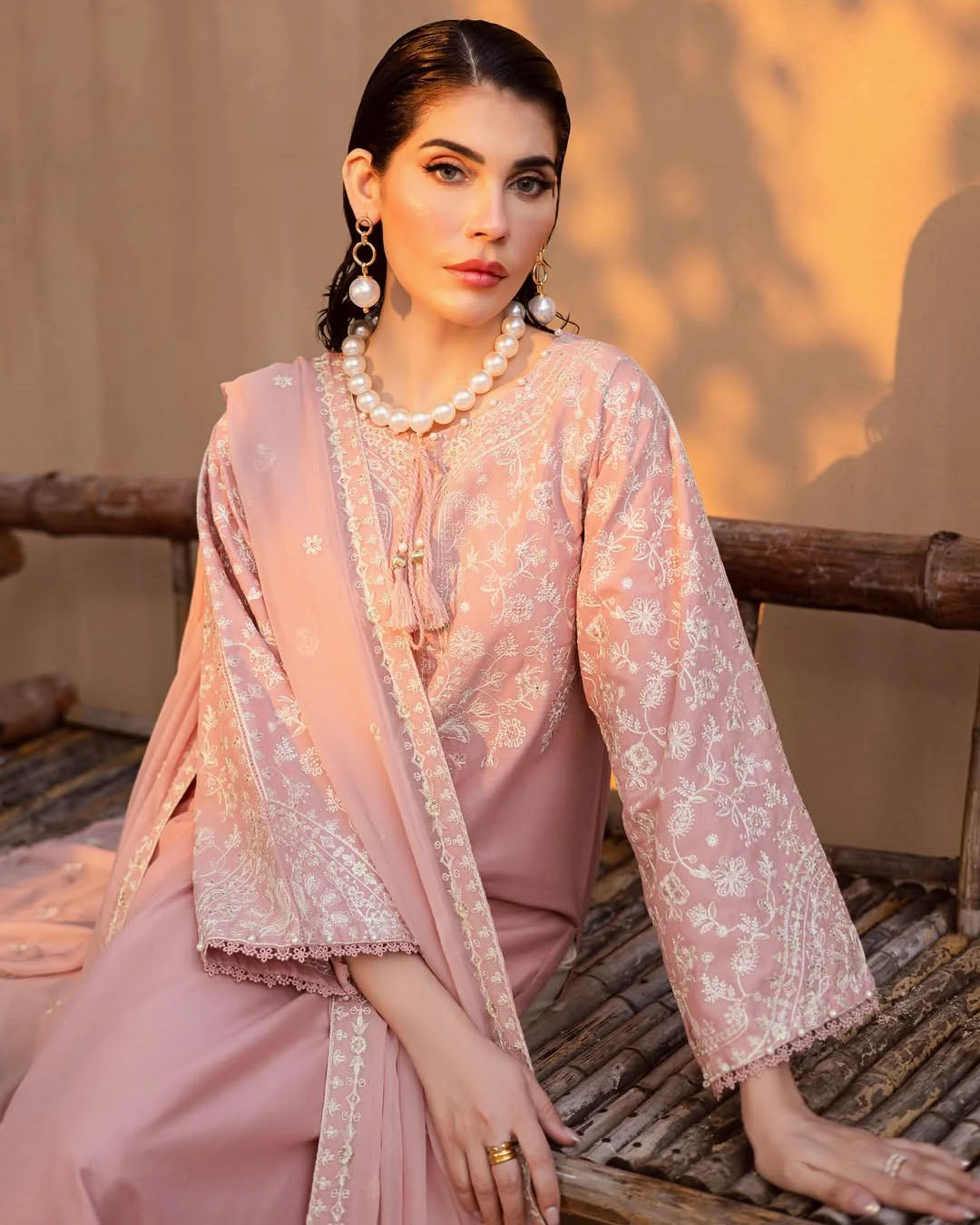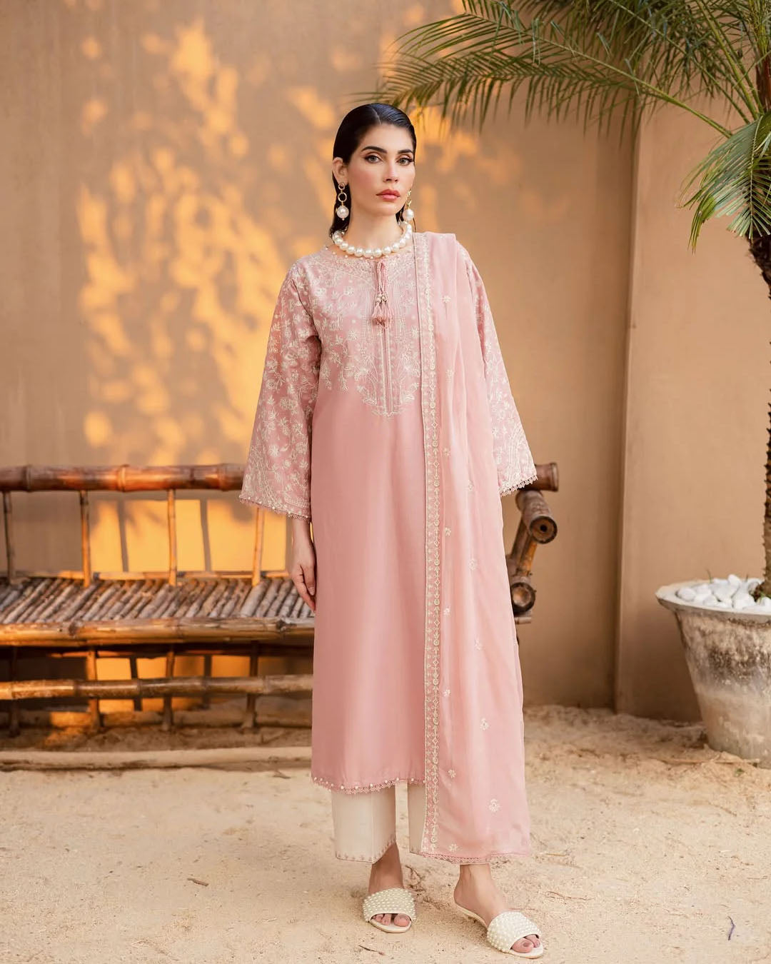 This elegant 3-piece stitched outfit features heavy embroidery on premium Khaddar, combining warmth with timeless style. The embroidered shirt, trouser, and Chiffon dupatta create a coordinated, graceful look—perfect for winter gatherings and festive occasions.